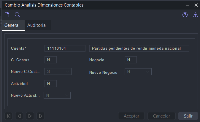 Este formulario fue diseñado para gestionar y modificar las dimensiones contables asociadas a las cuentas contables.